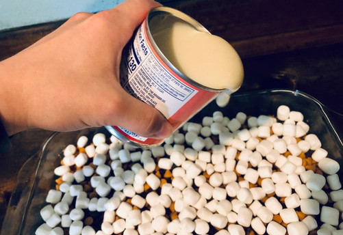 Then pour the can of sweetened condensed milk over the mixture making sure to completely cover the mini marshmallows. Bake 20 minutes or until bubbly.