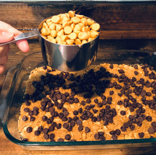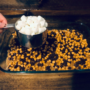 Next, in order, you are going to evenly sprinkle the chocolate chips, the butterscotch chips, and the mini marshmallows.